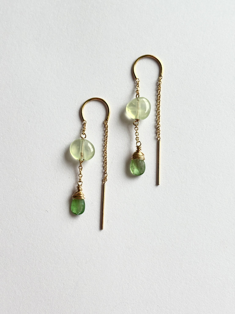 Tsavorite and prehenite make such a pretty duo! Inspired by hikes in the boreal forest, where the color green was (probably) invented. These earrings are super lightweight and easy to wear.