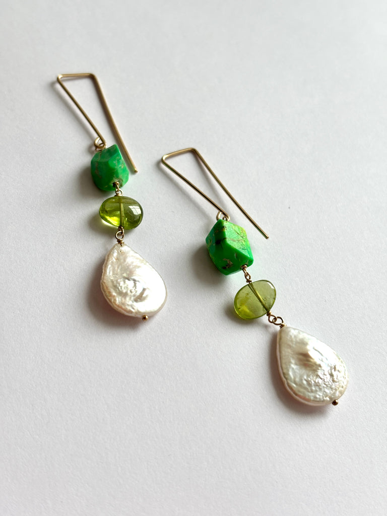 Classic pearls pair up with super vibrant green peridot and turquoise (heated, NOT dyed!) for these weird and wonderful earrings.